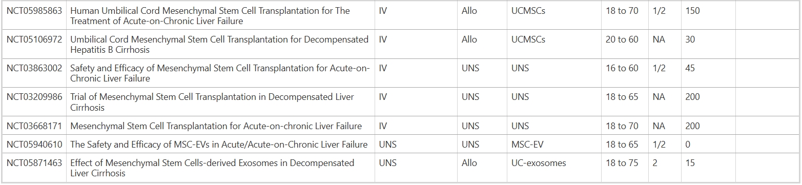 在針對肝衰竭或肝功能失代償的臨床試驗中,已有五項結果發表。