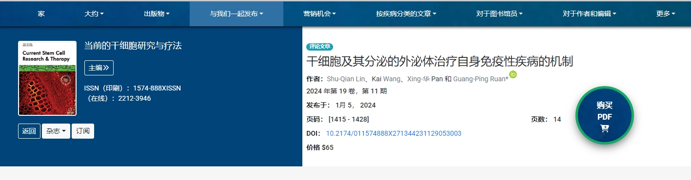 2024年,在國際期刊雜志《當前的干細胞研究與療法》發表一篇關于”干細胞及其分泌的外泌體治療自身免疫性疾病的機制“的文章,該文章旨在幫助廣大患有自身免疫性疾病的患者了解干細胞及外泌體治療自身免疫性疾病的具體機制。