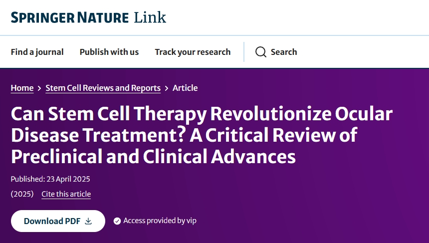 近日,著名期刊雜志“Stem Cell Reviews and Reports”(干細胞評論和報告)發表了一篇“Can Stem Cell Therapy Revolutionize Ocular Disease Treatment? A Critical Review of Preclinical and Clinical Advances”(干細胞療法能否徹底改變眼部疾病治療?臨床前及臨床進展綜述)的文章。