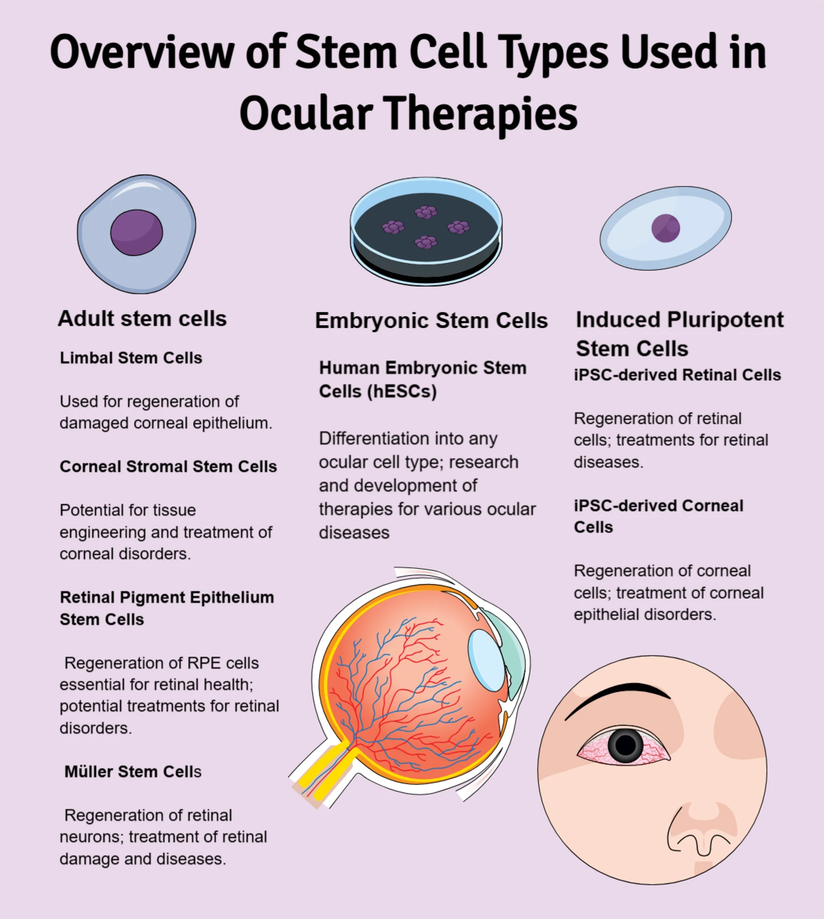 圖1:用于眼部治療的不同干細胞類型包括成體細胞、胚胎細胞和iPSC衍生細胞。這些細胞有助于視網膜和角膜再生,并具有潛在的治療應用。