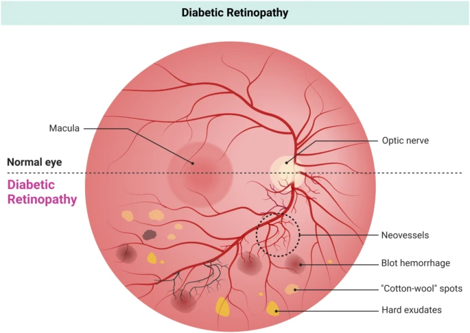 圖7:糖尿病視網膜病變圖示,顯示視網膜異常,例如新生血管、點狀出血、棉絨斑和硬性滲出物。對比圖突顯了正常視網膜與糖尿病引起的血管并發癥之間的差異。