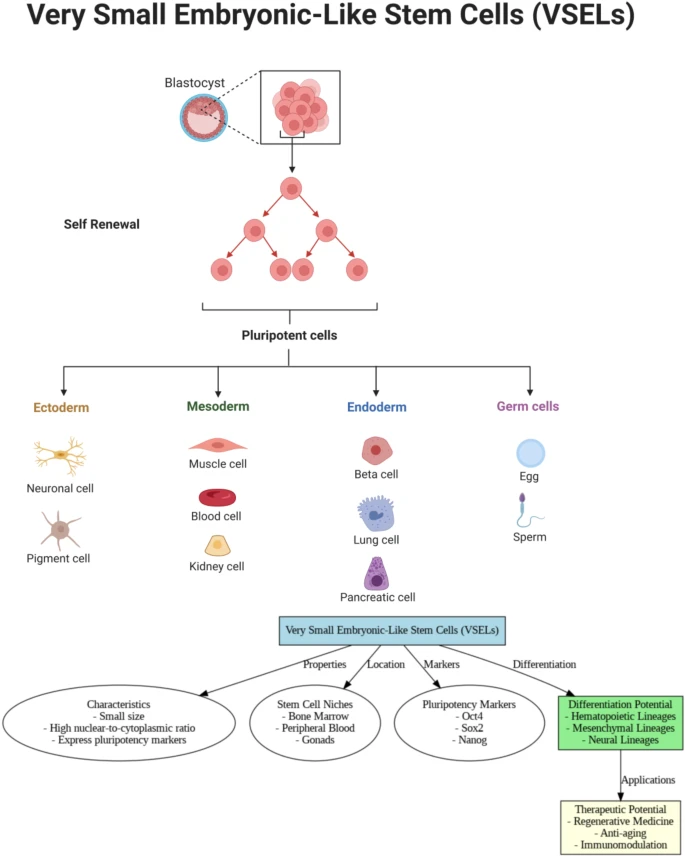 圖5:極小胚胎樣干細胞 (VSEL) 是具有分化成造血、間充質和神經譜系的潛能的多能細胞。它們存在于干細胞微環境,表達多能性標志物,在再生醫學、抗衰老和免疫調節方面具有治療潛力。
