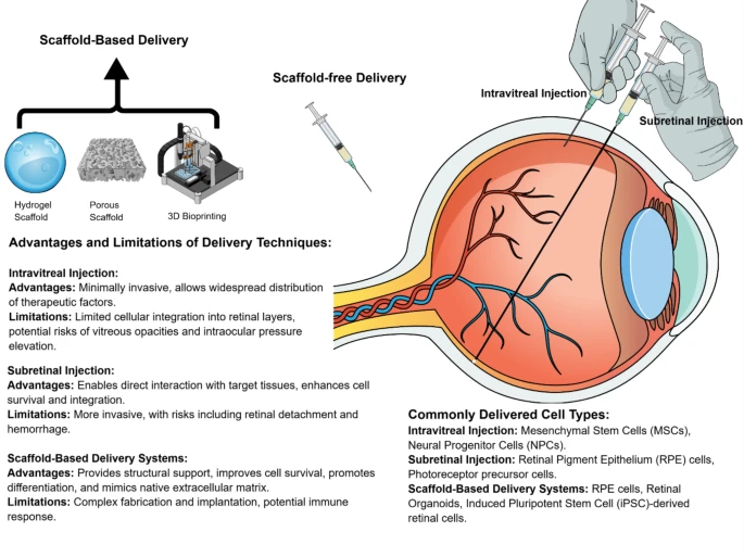 圖4:用于眼部治療的干細胞遞送技術包括無支架系統和基于支架的系統。玻璃體內注射和視網膜下注射等方法在療效、安全性和整合性方面各有不同。