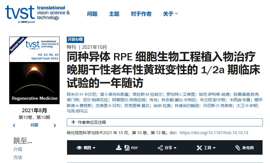 2024年,一項“干細胞衍生的生物工程視網膜色素上皮植入物治療地圖狀萎縮的1/2a期臨床試驗的長期隨訪”試驗報告顯示,基于支架的hESC衍生的RPE植入物是安全的,并且在中位三年的隨訪中顯示出良好的視力改善效果。