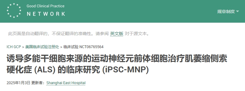 2025年1月,上海東方醫院開展iPSC來源運動神經元前體細胞治療ALS的I期試驗,探索多劑量移植的安全性與神經功能保護效果。