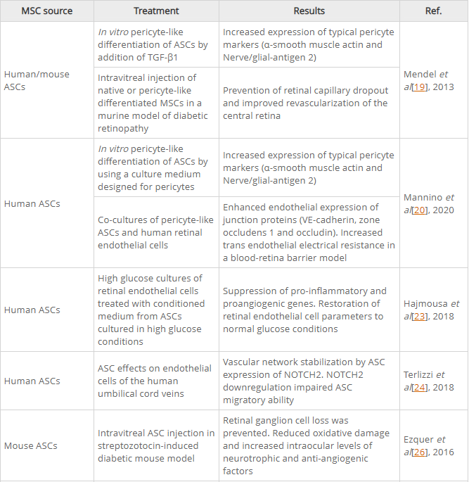 由于這些原因,許多研究都專注于開發(fā)可以在不可逆轉(zhuǎn)的損害發(fā)生之前減輕或阻止疾病進(jìn)展的療法。間充質(zhì)干細(xì)胞的治療幾項(xiàng)體外或動物模型研究表明,基于間充質(zhì)干細(xì)胞的策略可能是糖尿病視網(wǎng)膜病變治療的寶貴工具。表1總結(jié)了主要結(jié)果。