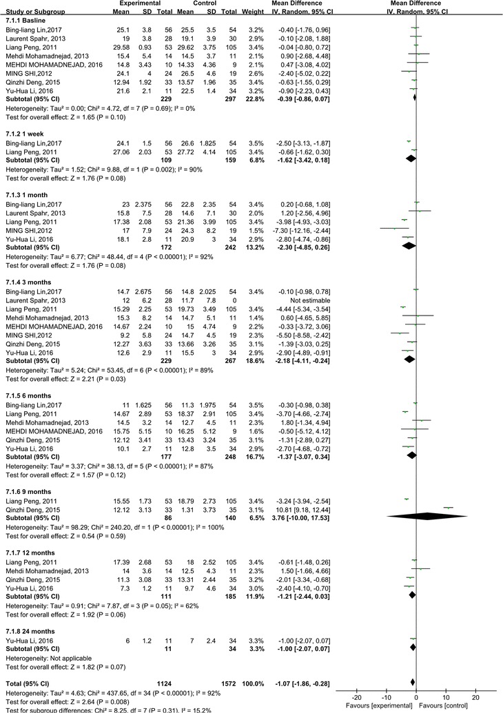 與對照組相比,干細胞治療后ALT水平顯著降低(p<0.00001)(圖5)。亞組分析顯示,干細胞治療組ALT水平也有所降低,在1周、1個月和6個月時間點均低于基線和相應(yīng)對照組。干細胞治療后9、12和24個月時ALT水平無顯著差異。關(guān)于1周、6和9個月時的ALT水平,未發(fā)現(xiàn)異質(zhì)性。但是,應(yīng)考慮1、3和12個月時 ALT水平的異質(zhì)性。但這只能通過一兩項研究來解釋。
