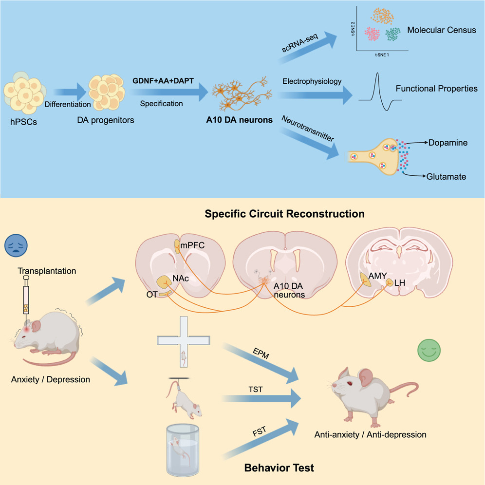 本研究首次證明,移植hPSC衍生的特定神經元亞型(A10) 可以精準重建該神經環路,并有效改善模型小鼠的行為異常