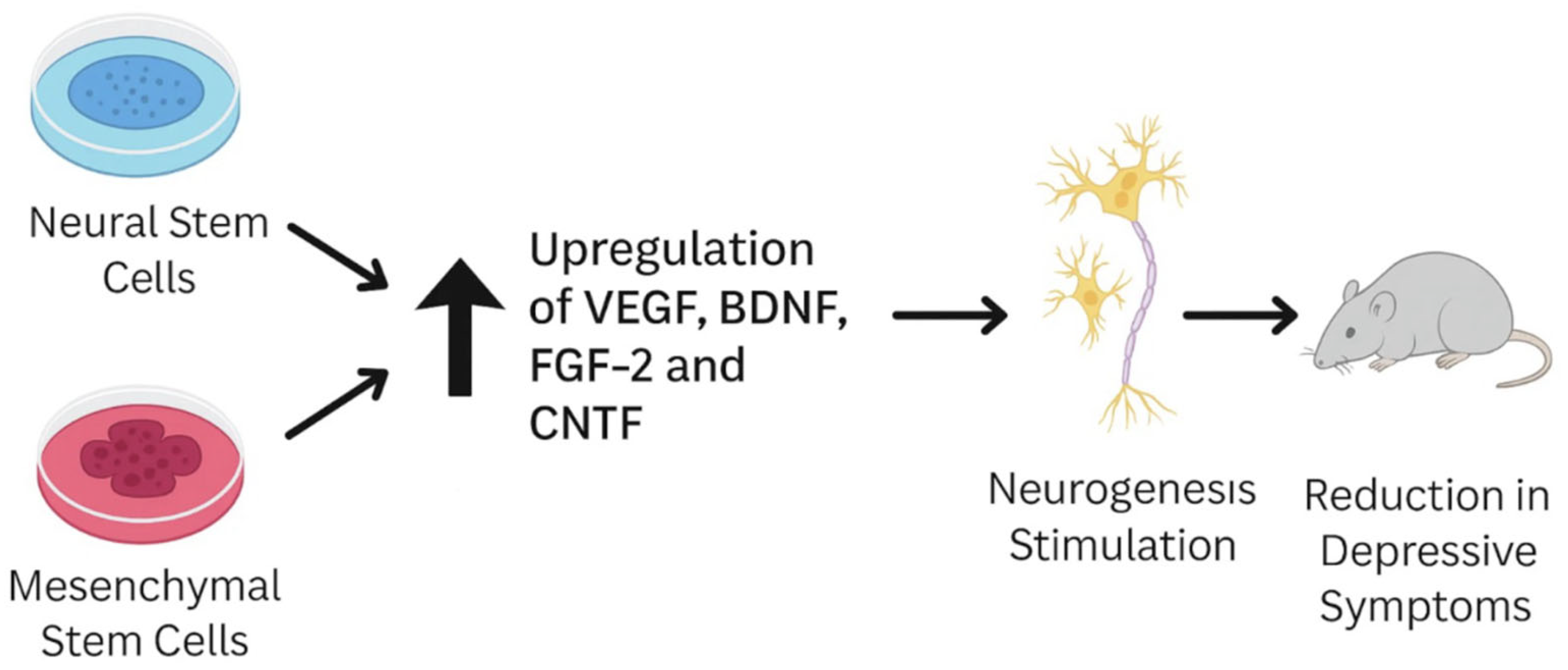 本綜述綜合了目前臨床前研究和早期臨床試驗中關(guān)于間充質(zhì)干細(xì)胞 (MSC)、神經(jīng)干細(xì)胞 (NSC) 和誘導(dǎo)性多能干細(xì)胞 (iPSC) 在緩解抑郁樣行為方面的有效性的證據(jù),并指出干細(xì)胞治療抑郁癥的主要機(jī)制包括增強(qiáng)海馬神經(jīng)發(fā)生、調(diào)節(jié)腦源性神經(jīng)營養(yǎng)因子 (BDNF)-TrkB通路、通過小膠質(zhì)細(xì)胞極化減輕神經(jīng)炎癥以及通過外周至中樞通路(例如迷走神經(jīng))恢復(fù)血清素信號傳導(dǎo)。
