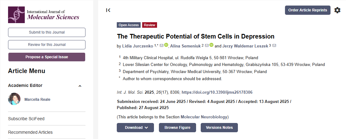 在此背景下,2025年8月27號,國際分子科學(xué)雜志發(fā)表了一篇題為“干細(xì)胞在抑郁癥中的治療潛力”的研究文章[1]。