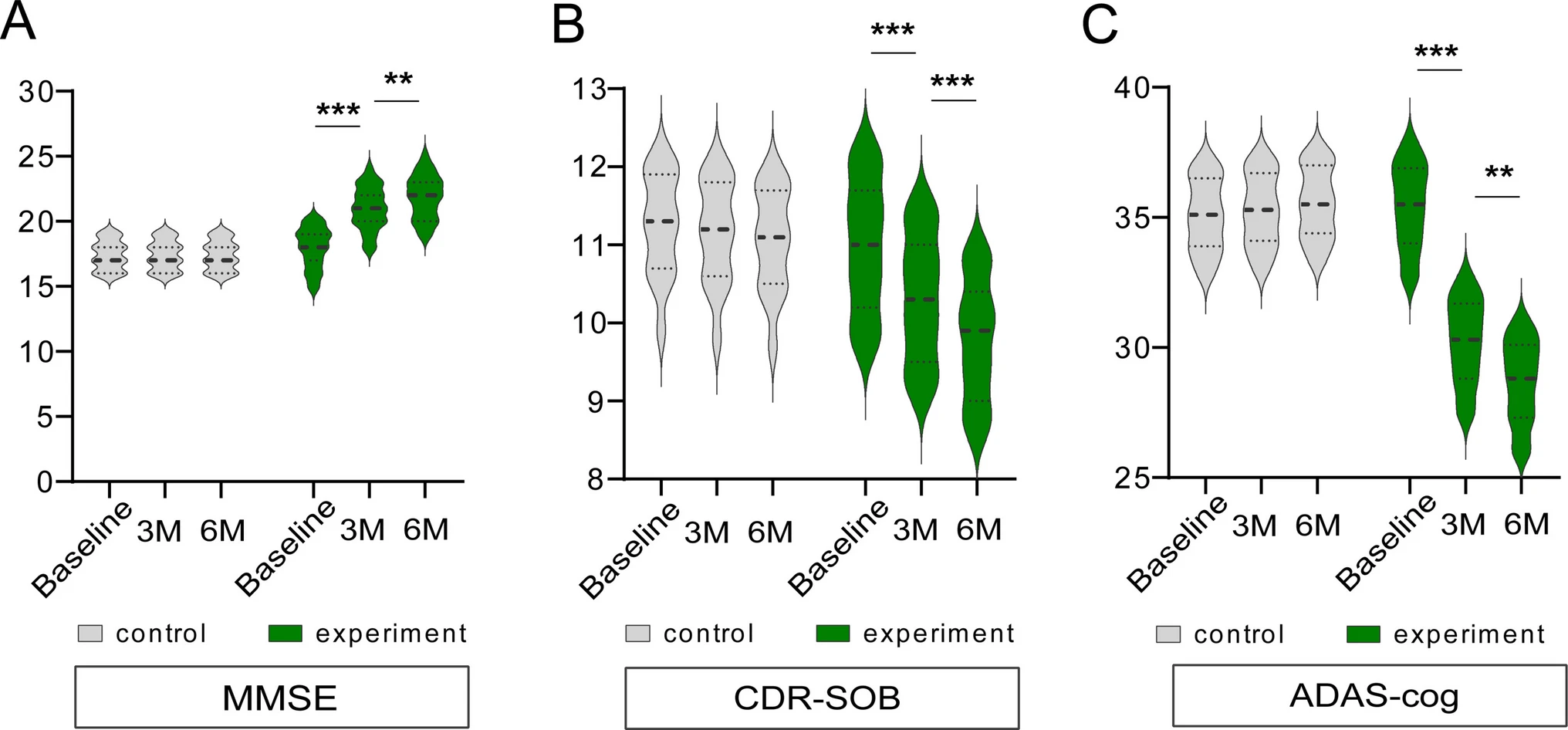 第一,在整體認知狀態(tài)方面,治療顯著提升了患者的MMSE評分(圖2A)。實驗組患者的MMSE平均分在治療3個月后即顯著增加3.4分,并在6個月時進一步提升至比基線高4.1分。相比之下,對照組的分數在整個研究期間無顯著變化。兩組改善程度的差異具有很大的效應量,且統(tǒng)計分析證實了治療與時間之間存在顯著的交互作用,表明認知提升是治療帶來的持續(xù)效果。