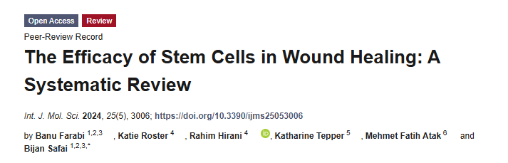 目前,相關作用機制研究多處于動物實驗階段,但已為臨床轉化奠定理論基礎。2024年,Farabi等在《International Journal of Molecular Sciences》上發表了一篇關于細胞治療慢性傷口的綜述,系統分析了干細胞療法在慢性傷口中的研究進展、臨床療效與安全性,為后續臨床應用提供了依據。