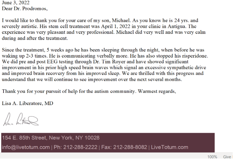 “普羅德羅莫斯博士說:”我們在安提瓜提供的簡單間充質干細胞療法對治療自閉癥始終有效。”在我們正在進行的臨床試驗中,89%的患者記錄并維持了顯著的改善。 改善最常見的形式是更加平靜、睡眠更好和社交溝通得到改善。