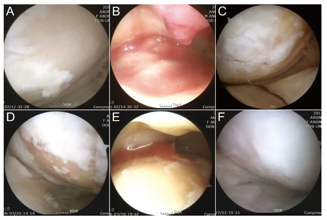 A/D為治療前,白色示意軟骨,淺黃色示意裸露的骨。B/E為間充質(zhì)干細(xì)胞注射。C/F為治療后的關(guān)節(jié)鏡檢查。