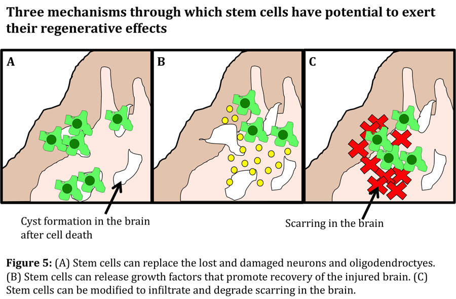 隨著研究的進展,我們發現干細胞可以被誘導成為更專門的細胞類型,當移植到體內時,它們可以為受損的環境提供支持。此外,我們可以修飾這些干細胞以表達某些可以增強這種能力的因子。我們還可以修改細胞以表達疤痕降解因子,這有助于減少大腦疤痕并促進康復。