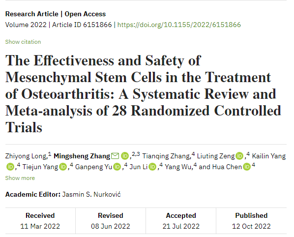 參考資料:Zhiyong Long, Mingsheng Zhang, Tianqing Zhang, Liuting Zeng, Kailin Yang, Tiejun Yang, Ganpeng Yu, Jun Li, Yang Wu, Hua Chen, “The Effectiveness and Safety of Mesenchymal Stem Cells in the Treatment of Osteoarthritis: A Systematic Review and Meta-analysis of 28 Randomized Controlled Trials”, Stem Cells International, vol. 2022, Article ID 6151866, 22 pages, 2022. https://doi.org/10.1155/2022/6151866。