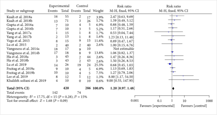 十項(xiàng)隨機(jī)對(duì)照試驗(yàn)報(bào)告了不良事件的數(shù)量或頻率。異質(zhì)性檢驗(yàn)表明異質(zhì)性較低(%,); 因此,采用固定效應(yīng)模型進(jìn)行分析。結(jié)果表明,MSC注射液與對(duì)照組的安全性無(wú)顯著差異[1.20(0.97,1.48),](圖5)。其他隨機(jī)對(duì)照試驗(yàn),所有人都沒有報(bào)告嚴(yán)重的不良事件。