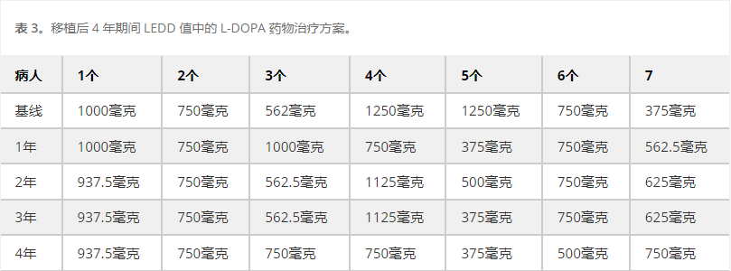 干預似乎是安全的。在移植后4年,我們現(xiàn)在可以報告未分化的人神經祖細胞可以通過雙側立體定向輸送到中度至重度帕金森病患者的殼核,沒有任何因手術引起的并發(fā)癥。沒有患者表現(xiàn)出不良的運動障礙(運動障礙)、腫瘤形成或任何可檢測到的對移植細胞的免疫反應。在七分之六的案例中,該程序改善了運動功能,并對L-DOPA 產生了更好的反應(特別是在一個值得注意的案例中)。