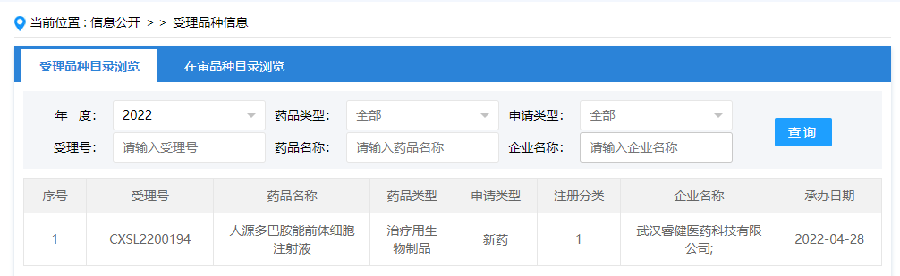 2022年4月28日,據國家藥監局藥品審查中心(CDE)官網-受理品種信息公示,武漢睿健醫藥科技有限公司(簡稱“睿健醫藥”)“人源多巴胺能前體細胞注射液”(代號:NouvNeu001)臨床試驗申請(IND)已獲受理(受理號:CXSL2200194)。