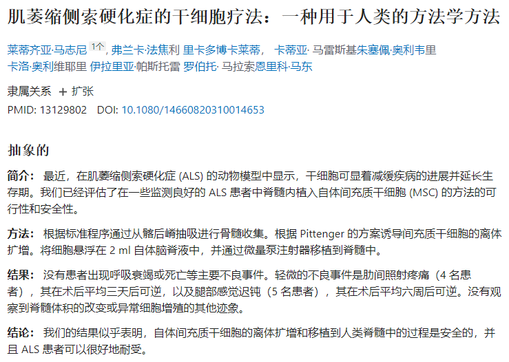 6. Aljabri Ammar, Halawani Alhussain, Bin Lajdam Ghassan, Labban Suhail, Alshehri Samah, Felemban Razaz. The Safety and Efficacy of Stem Cell Therapy as an Emerging Therapy for ALS: A Systematic Review of Controlled Clinical Trials.?Frontiers in Neurology, 12, 2021.?DOI=10.3389/fneur.2021.783122