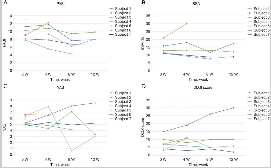 結果:該圖顯示了 7 位參與者的四個結果:PASI評分從基線到第12周的改善率范圍為-0.36%至46%,PASI評分從基線到第12周逐漸下降。