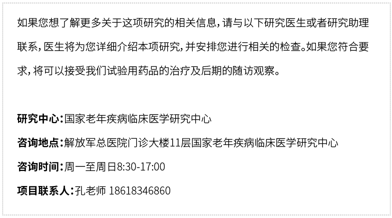 如果您想了解更多關于這項研究的相關信息,請與以下研究醫生或者研究助理聯系,醫生將為您詳細介紹本項研究,并安排您進行相關的檢查。如果您符合要求,將可以接受我們試驗用藥品的治療及后期的隨訪觀察。