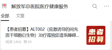 近日,解放軍總醫院第一醫學中心(即常說的“301醫院”)兒科發布一項臨床研究招募信息,宣布開展 ALT002(應激誘導的間充質干細胞衍生物) 用于治療孤獨癥譜系障礙(ASD) 的臨床研究。該研究已通過倫理審查,現面向社會招募符合條件的患兒。