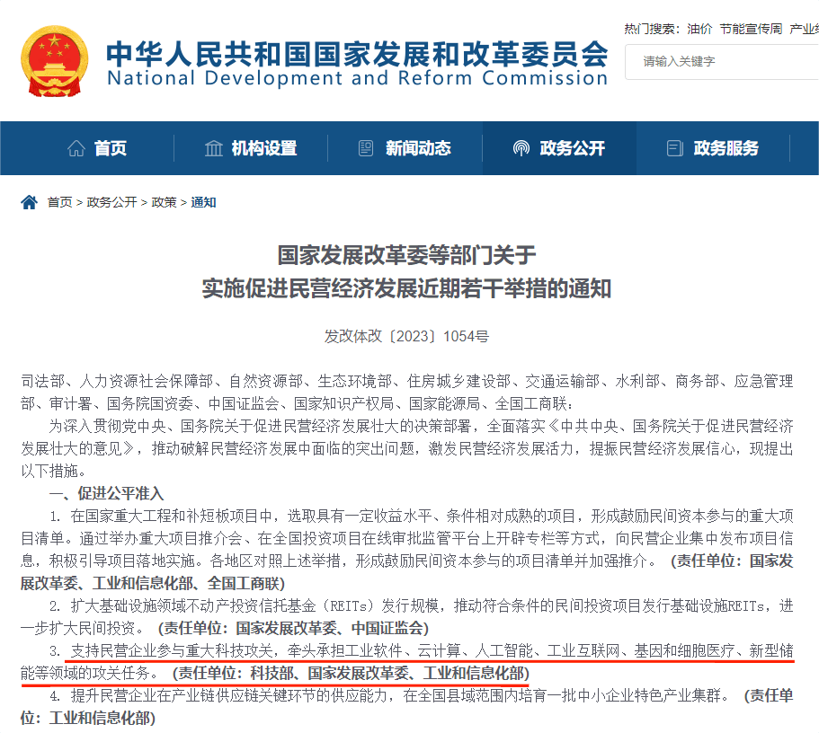8月1日,國家發改委等部門聯合發布關于實施促進民營經濟發展近期若干舉措的通知,聚焦促進公平準入、強化要素支持、加強法治保障、優化涉企服務、營造良好氛圍等5個重要方面,提出28條具體措施。其中在“促進公平準入”方面指出要“支持民營企業參與重大科技攻關,牽頭承擔工業軟件、云計算、人工智能、工業互聯網、基因和細胞醫療、新型儲能等領域的攻關任務”。(來源:國家發改委官網)