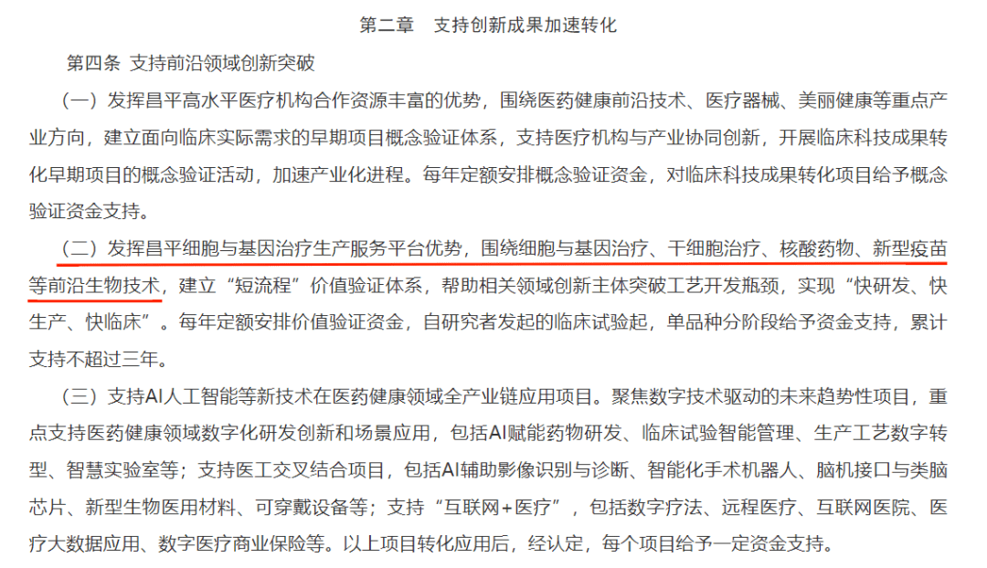 8月1日,北京市昌平區人民政府印發《中國(北京)自貿試驗區科技創新片區昌平組團促進醫藥健康產業發展支持辦法》,重點支持包括細胞與基因治療(CGT)在內的四大方向,實現細胞與基因治療、干細胞治療等前沿生物技術及相關領域的創新突破。(來源:昌平區人民政府官網)
