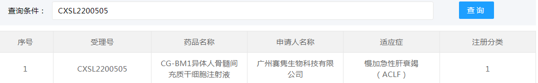 廣州賽雋生物科技有限公司的“CG-BM1異體人骨髓間充質(zhì)干細胞注射液”(受理號:CXSL2200505)獲得新藥臨床試驗?zāi)驹S可,適應(yīng)證為:慢加急性肝衰竭(ACLF)。這是該干細胞注射液的第二種適應(yīng)證,此前已獲得默示許可用于注射給藥用于感染引起的中重度成人急性呼吸窘迫綜合征(ARDS)(受理號:CXSL2101334)的臨床試驗。